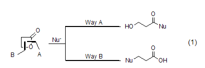 2. β-propanolactone is mainly used as a three-carbon synthon in organic synthesis. depending on the reaction conditions or the nucleophile in the reaction, the reaction can selectively proceed along pathway a or pathway b to generate two different types of products (formula 1).