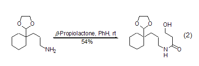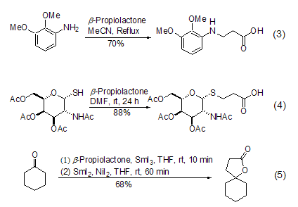 β- propanolactone and phenol[5], aromatic amines[6,7], thiols[8], ketones or imines [9]the reaction occurs selectively along pathway b. under these conditions, aromatic amines can easily generate β-aminopropionic acid (formula 3). thiol and β- propionolactone form β- thioether propyl acid reactions are particularly useful in the synthesis of sulfur-containing sugar compounds. the mild reaction conditions hardly have any effect on other functional groups (formula 4). ketones or imines will generate cyclic structural compounds, and if they react with cyclic ketones or cyclic ketimines, they will generate products with spirocyclic structures (formula 5).